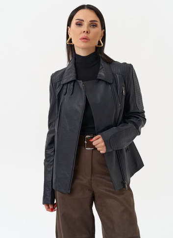 Длина изделия - 60 см;Длина рукава - полный;Цвет -синий;Материал - натуральная кожа;Фасон - приталенный;Вид застежки - молния;Вид ворота - стойка