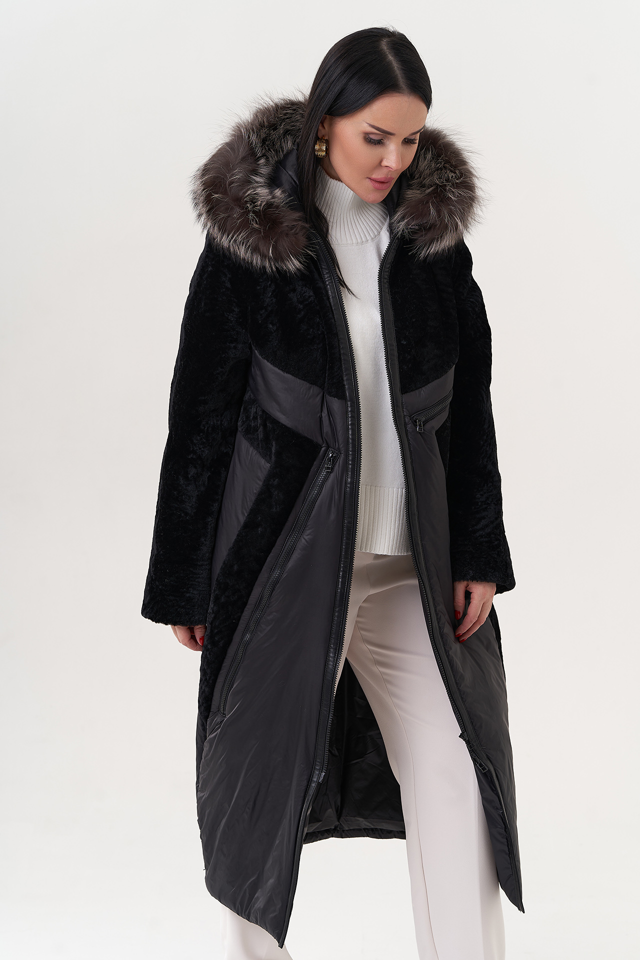 Вид ворота - капюшон, отделка - чернобурая лиса