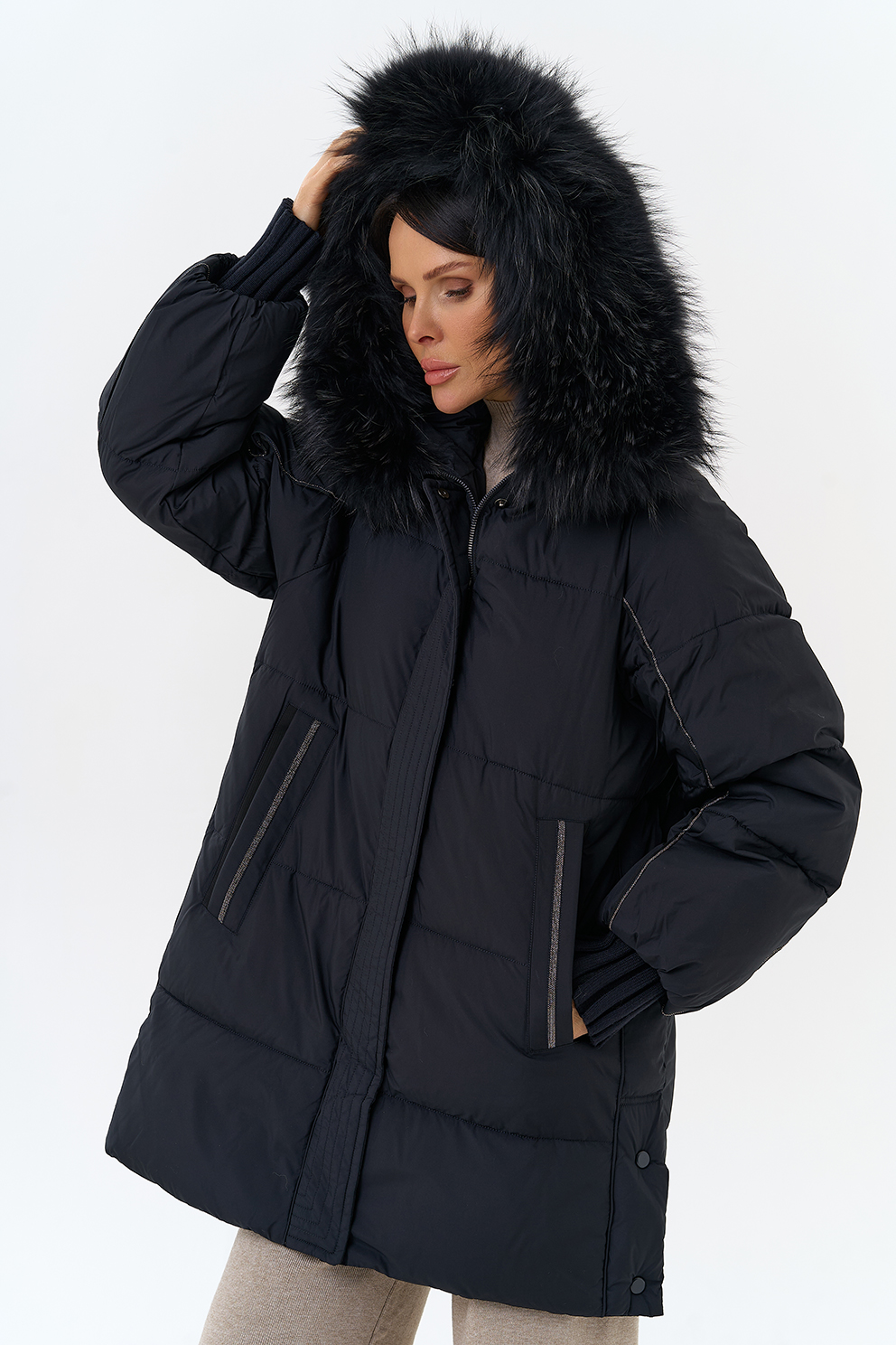 Крой воротника - капюшон, отделка енот
